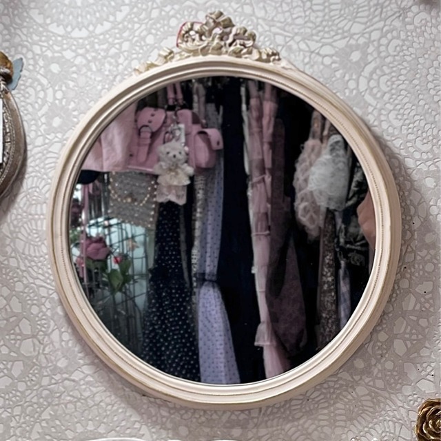 リボンの彫刻がエレガントなの壁掛けタイプの鏡。 アンティークな雰囲気のアイボリーです。 ヨーロピアンなお部屋づくりにいかがでしょうか? サイズ: 22×25×1.5㎝ 素材: ポリレジン、ガラス