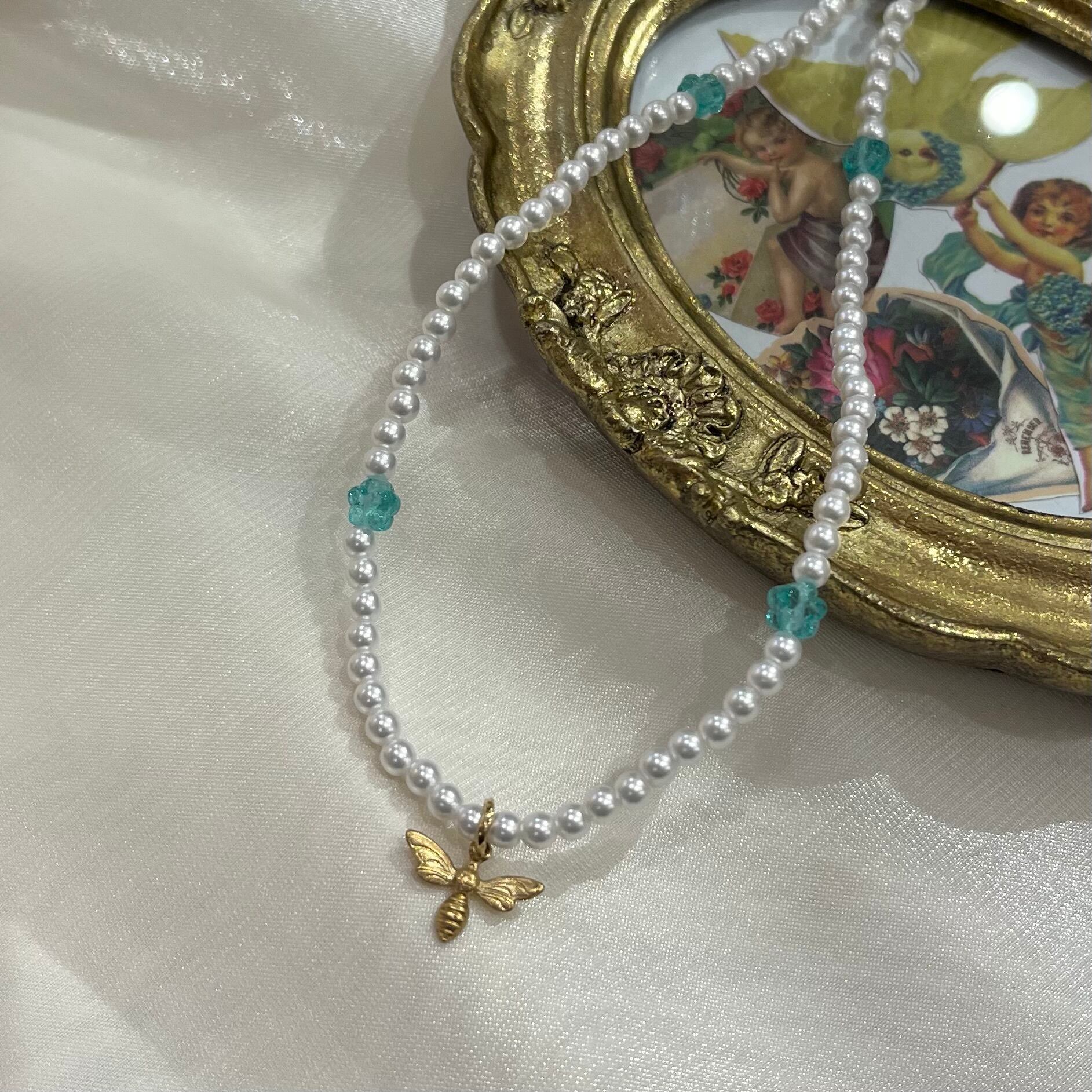 小さなホワイトパールにオーロラブルー(メタリックな濃い青色)のお花ビーズをmixしたショートネックレス。