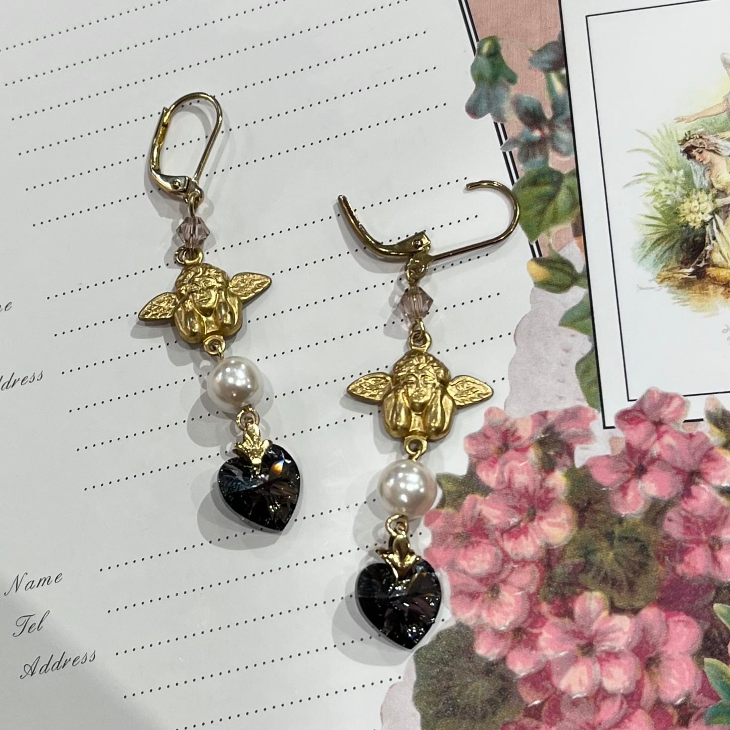 頬杖をついた天使にハートのビジューが揺れるピアス、イヤリングです。