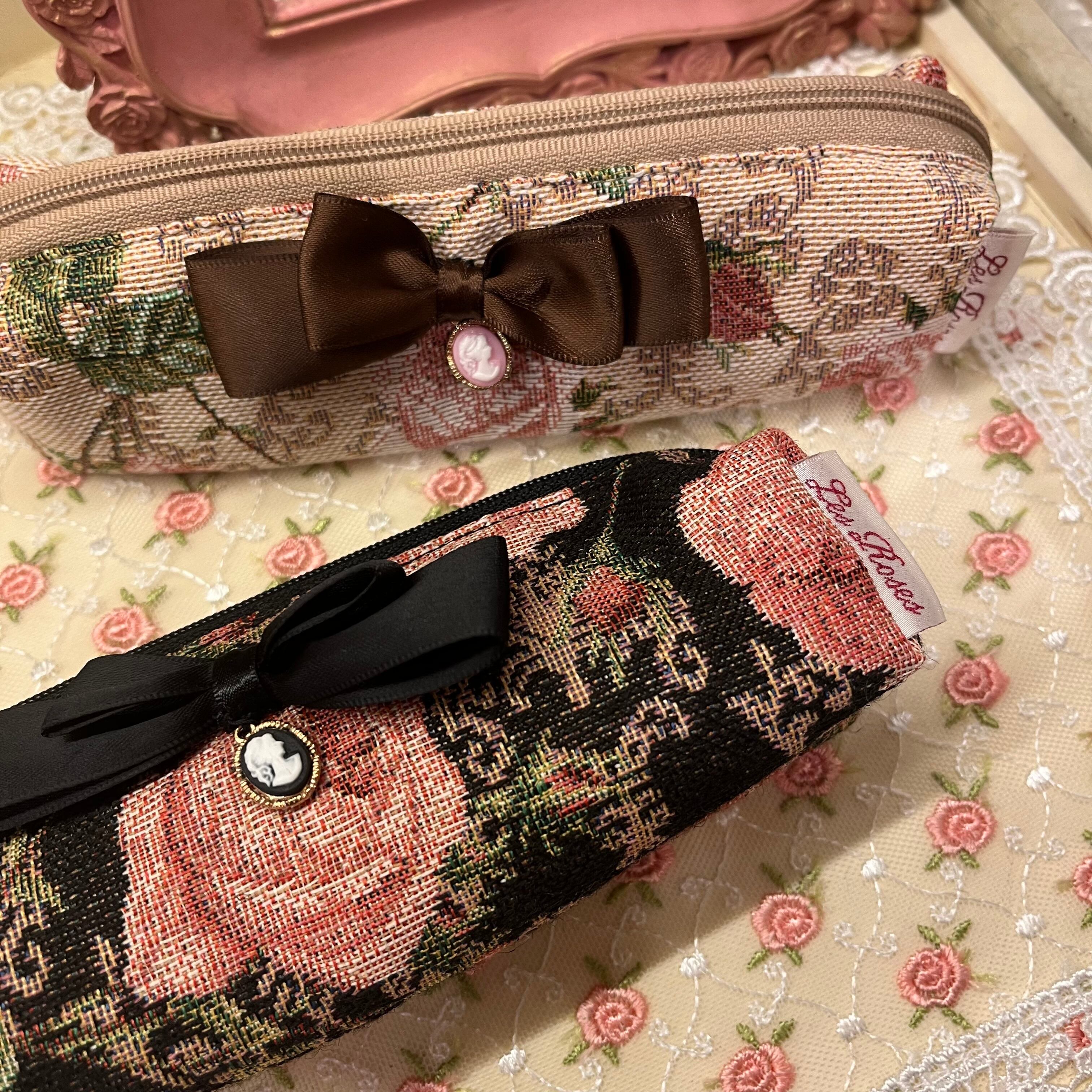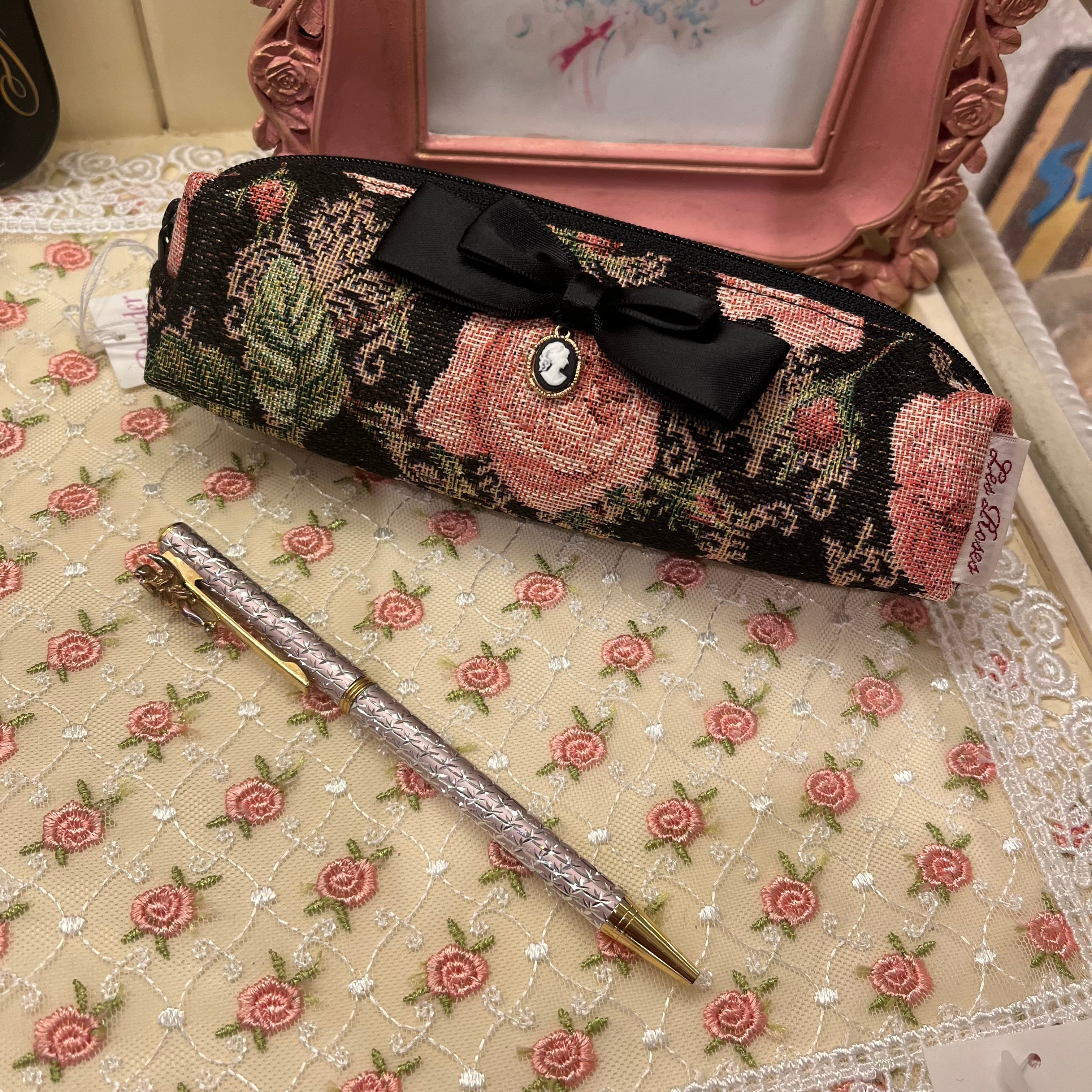 バラ柄のジャガード生地に小さなカメオチャームが揺れるペンポーチ。