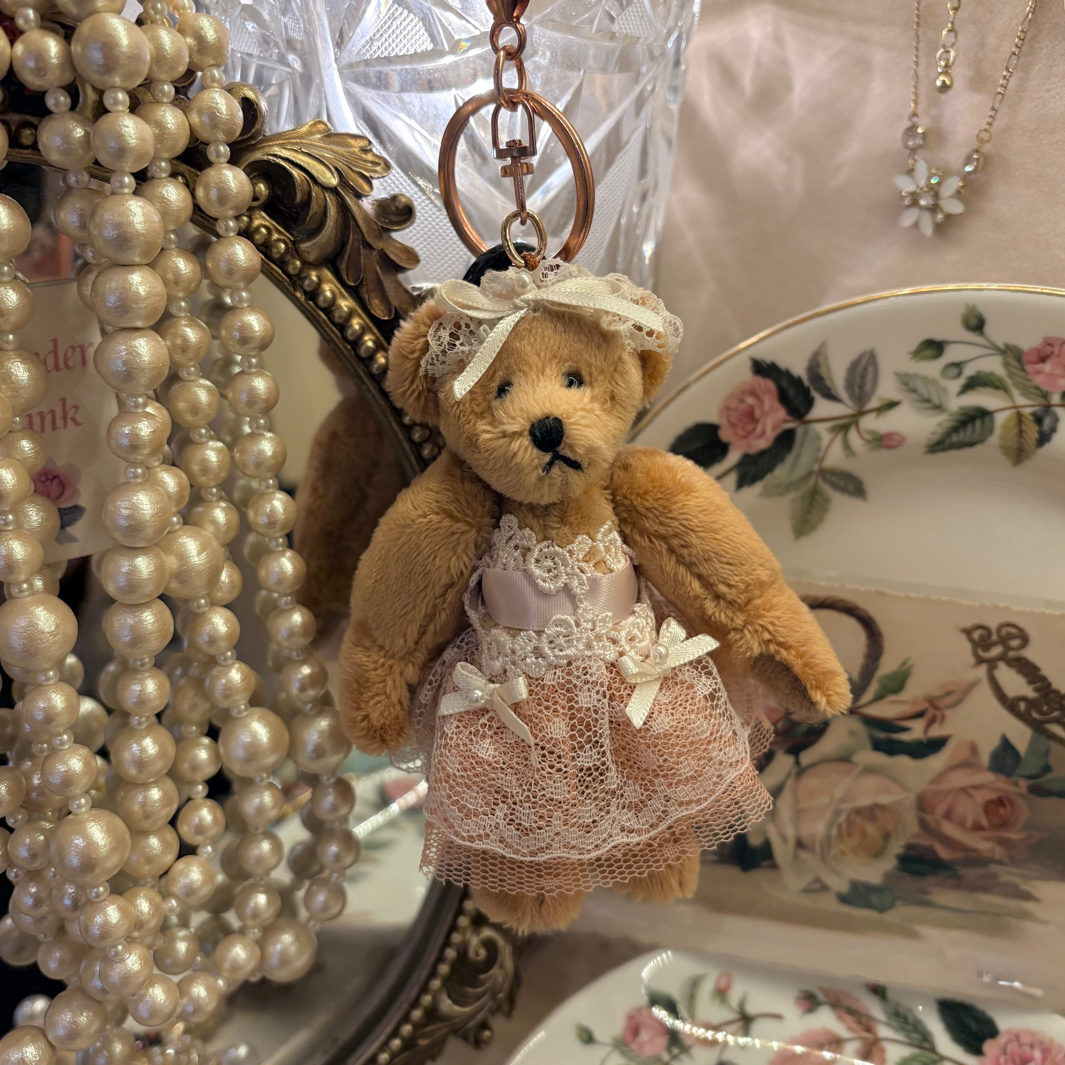 ベビードールみたいなピンクのドレスでおめかししたテディベアのかわいいバッグチャームです。
