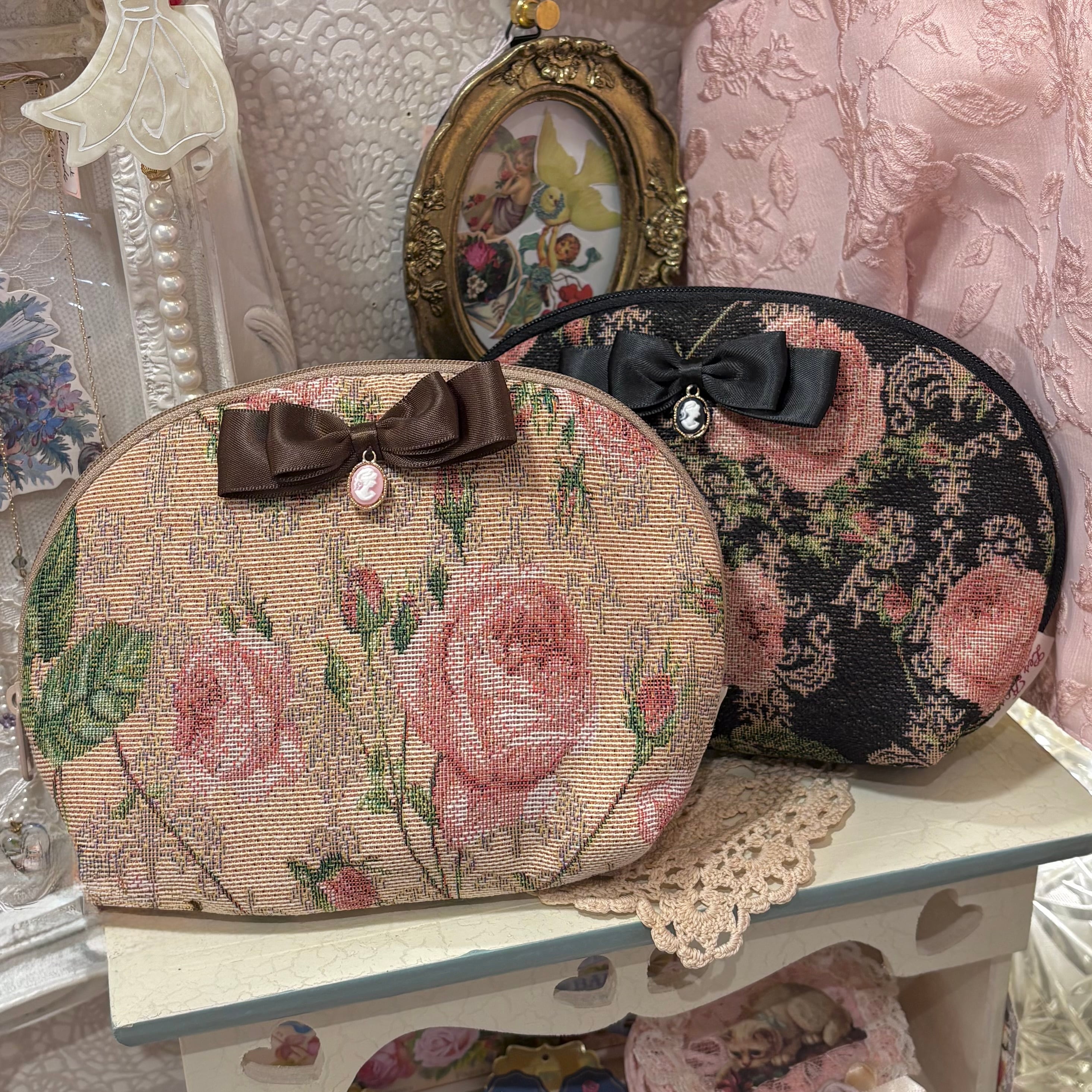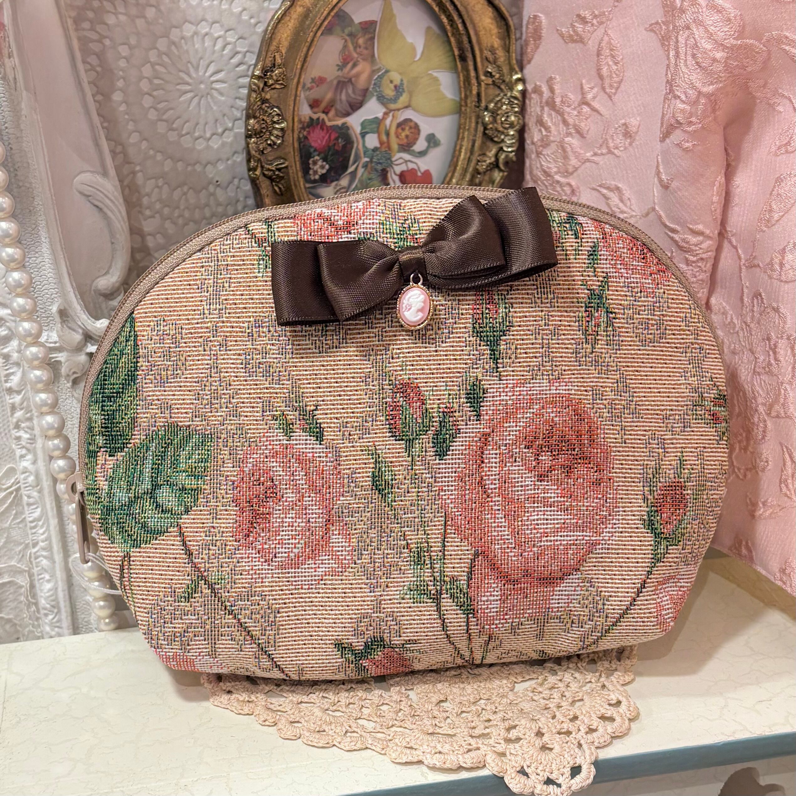 ローズ柄のジャガード生地ににカメオチャームつきのリボンがかわいいシェル型のポーチです。