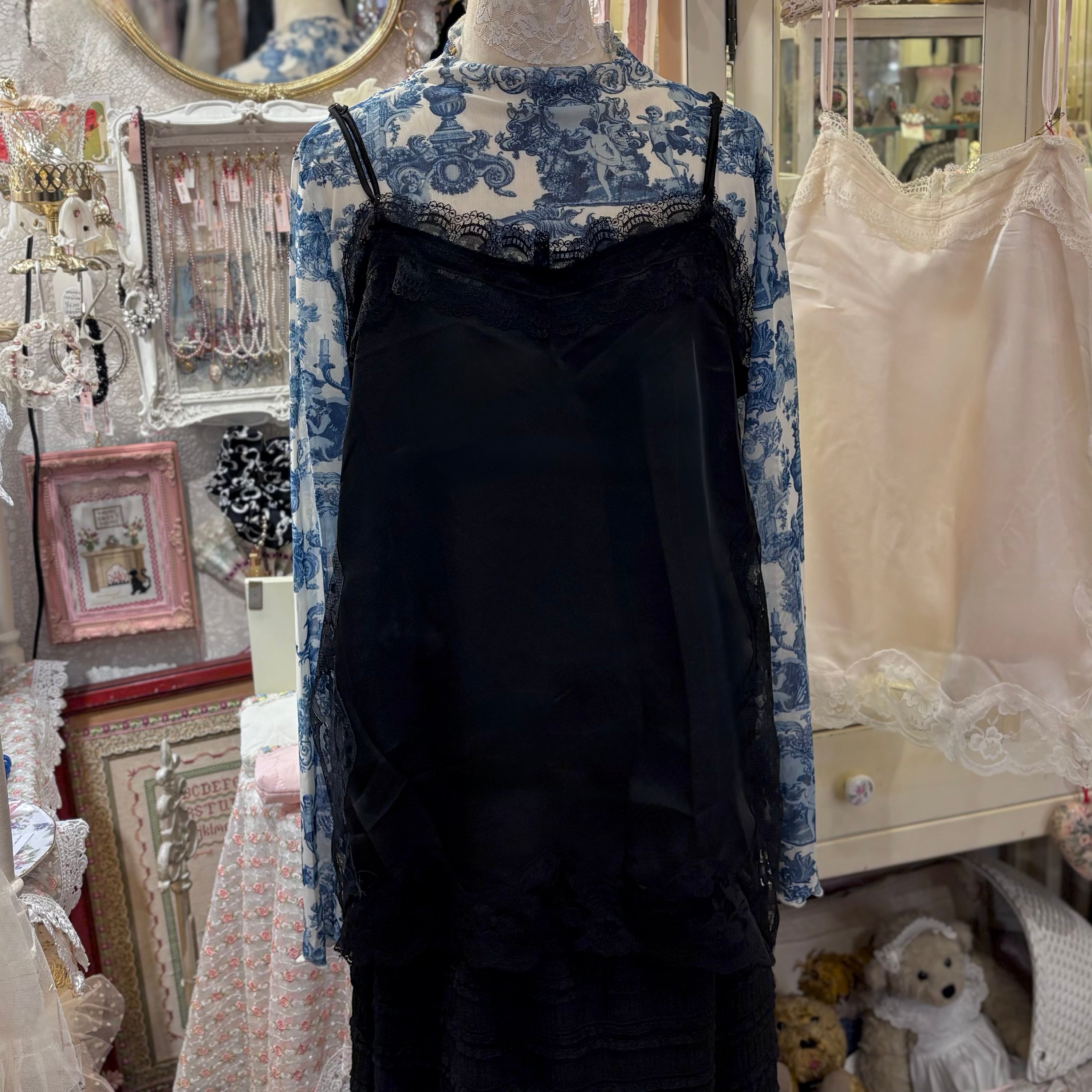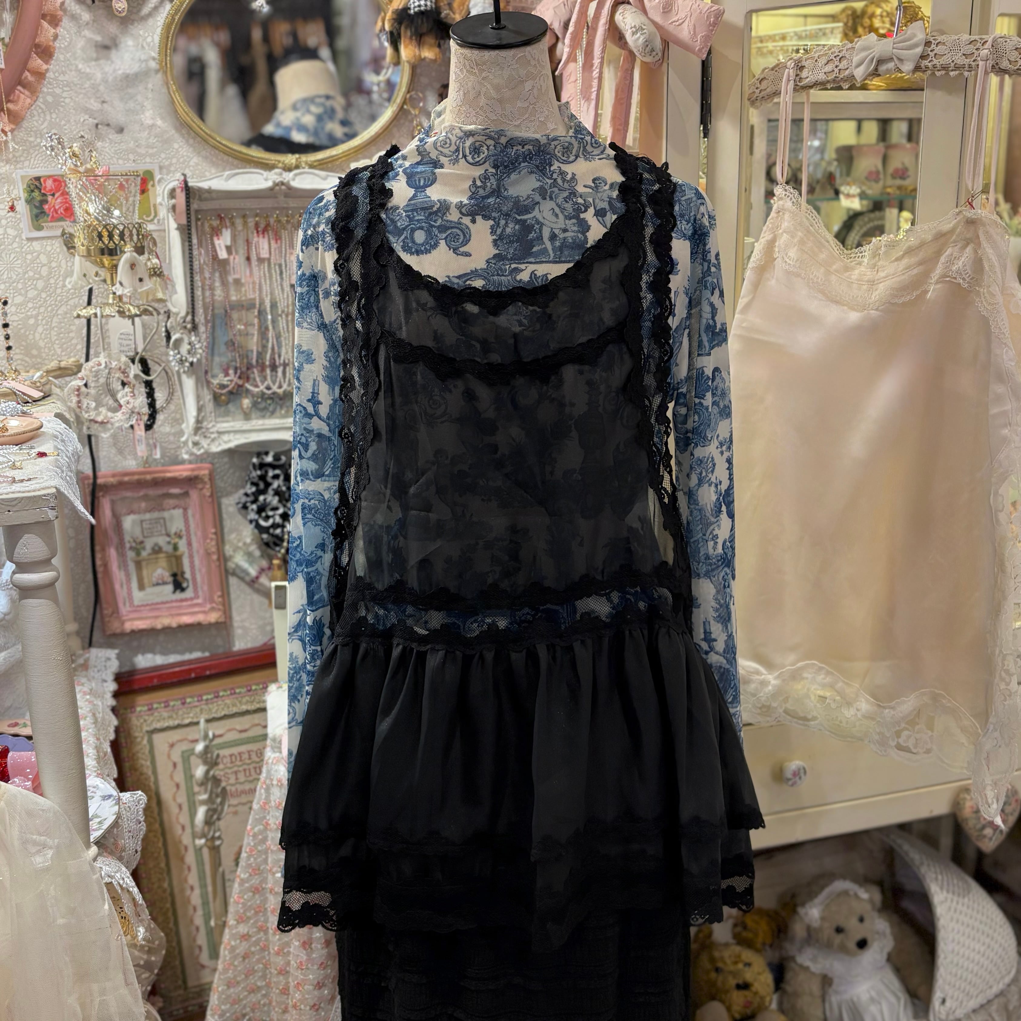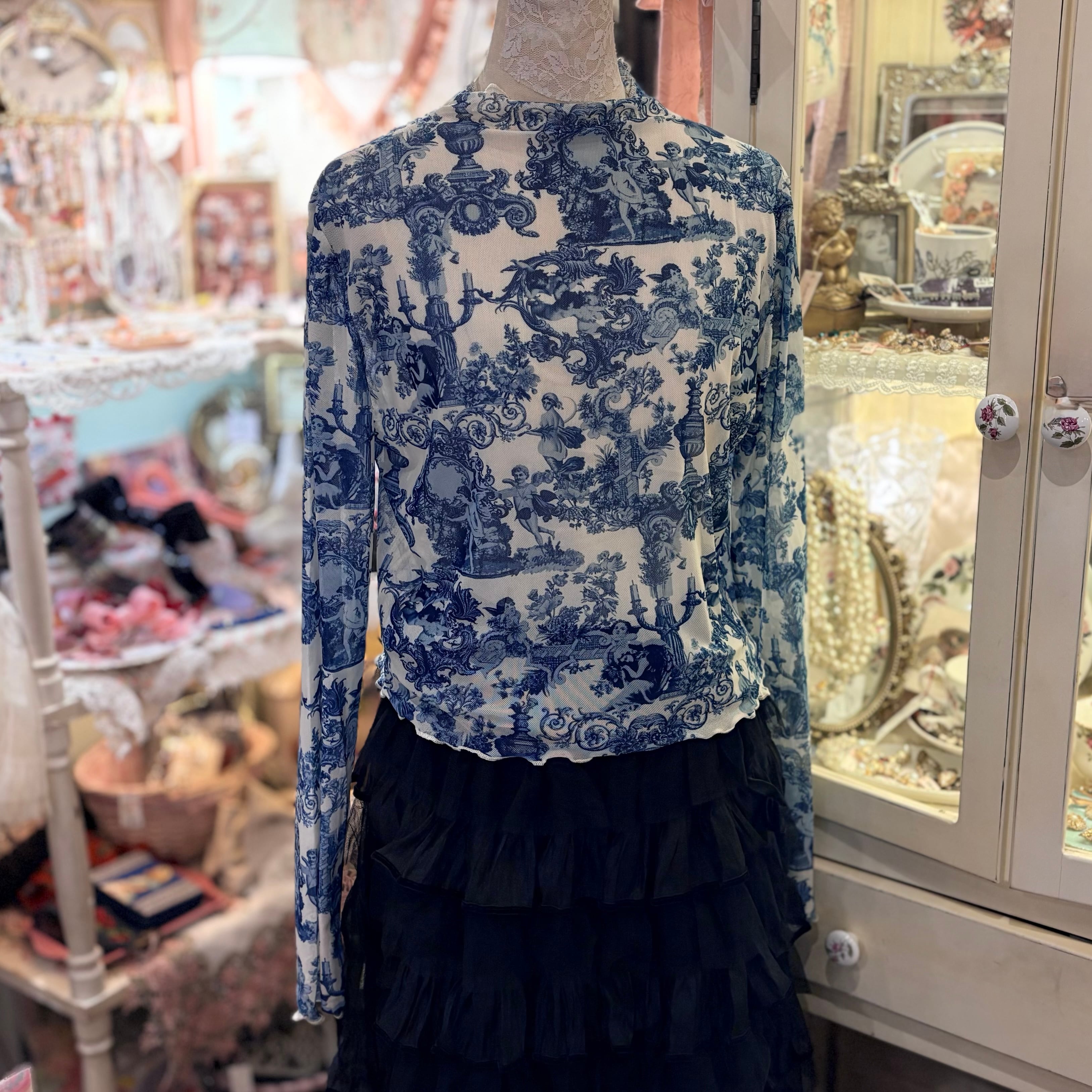 白地に絵画のようなブルーの天使柄が全プリントされたシースルー素材のトップス。