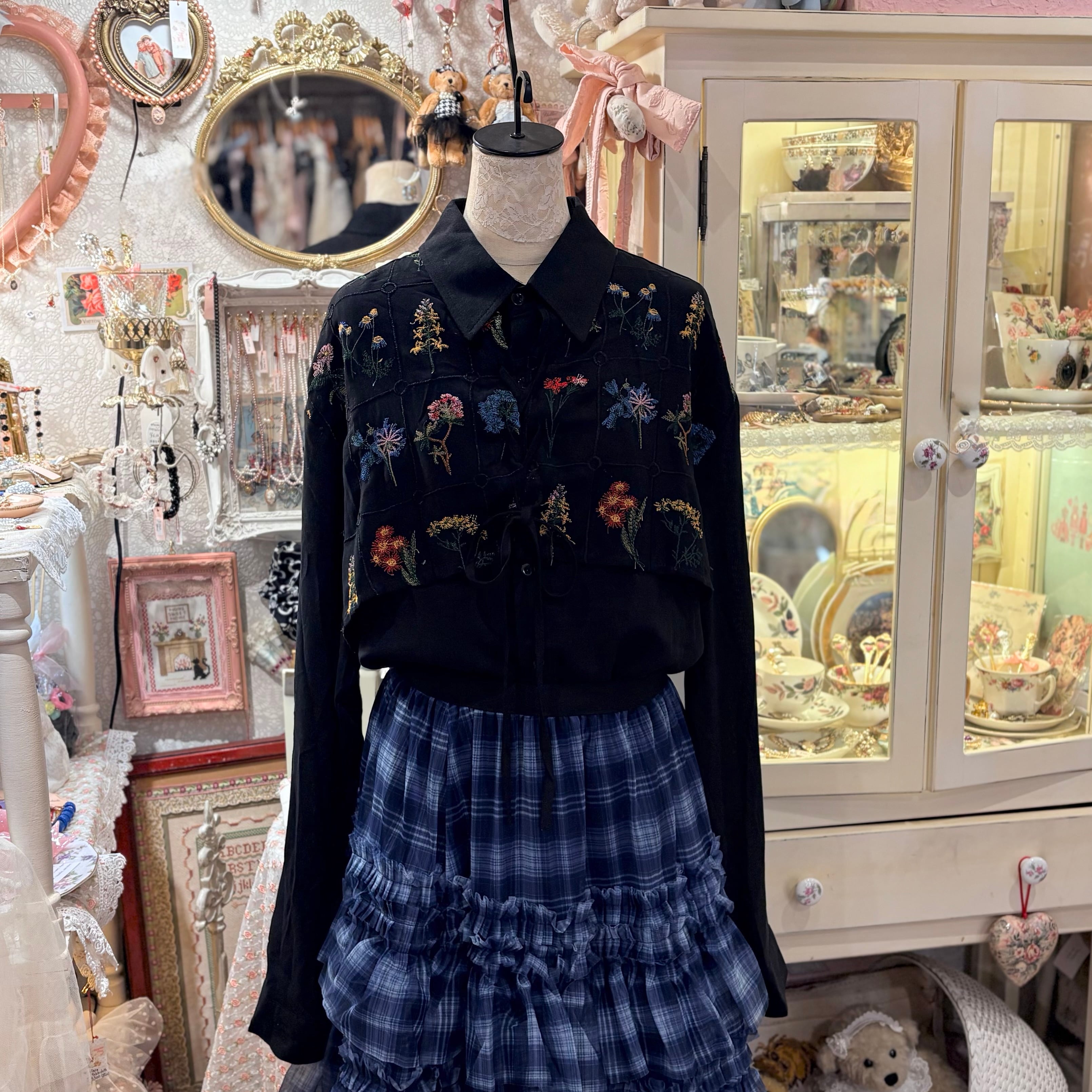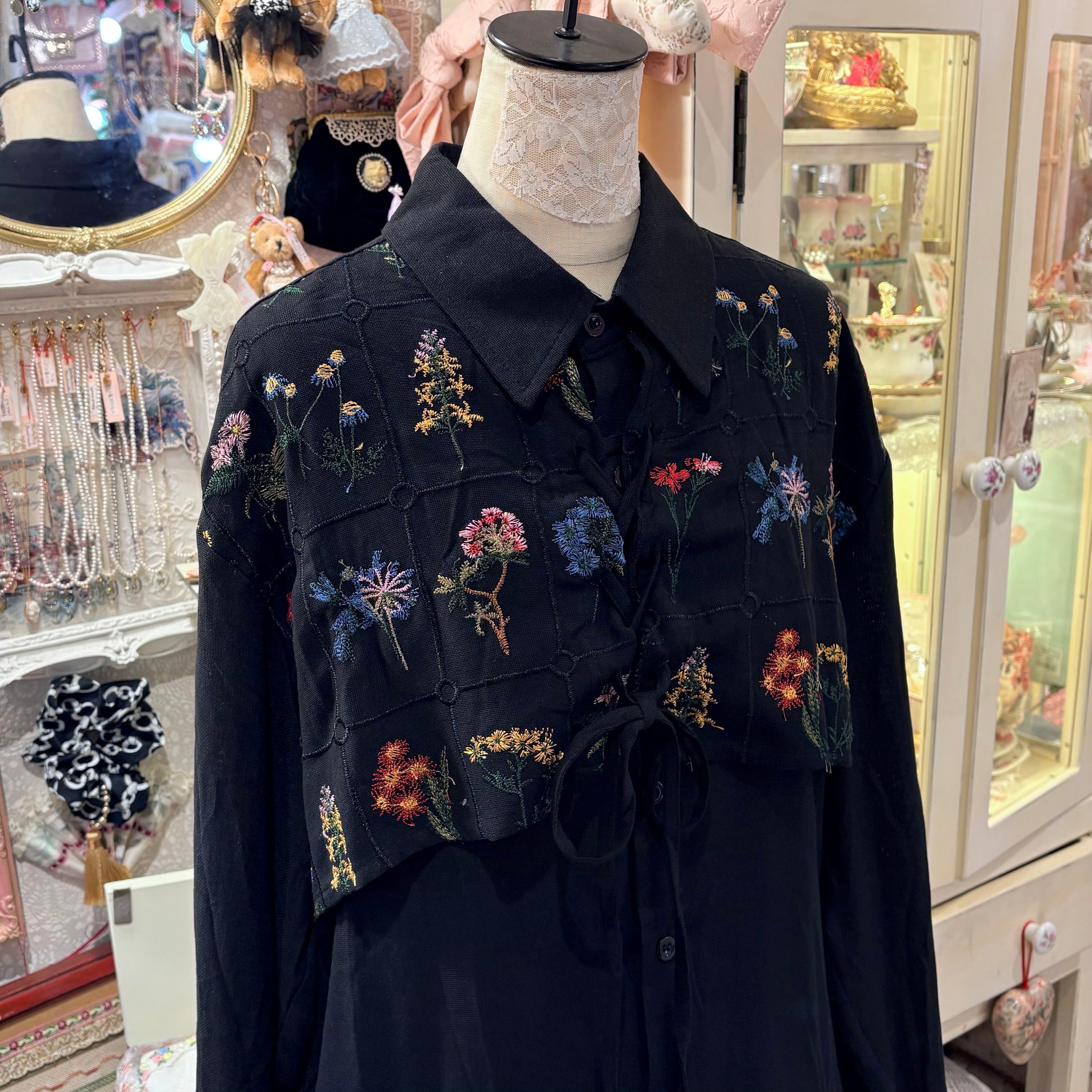 ボタニカル刺繍レースアップブラウス