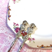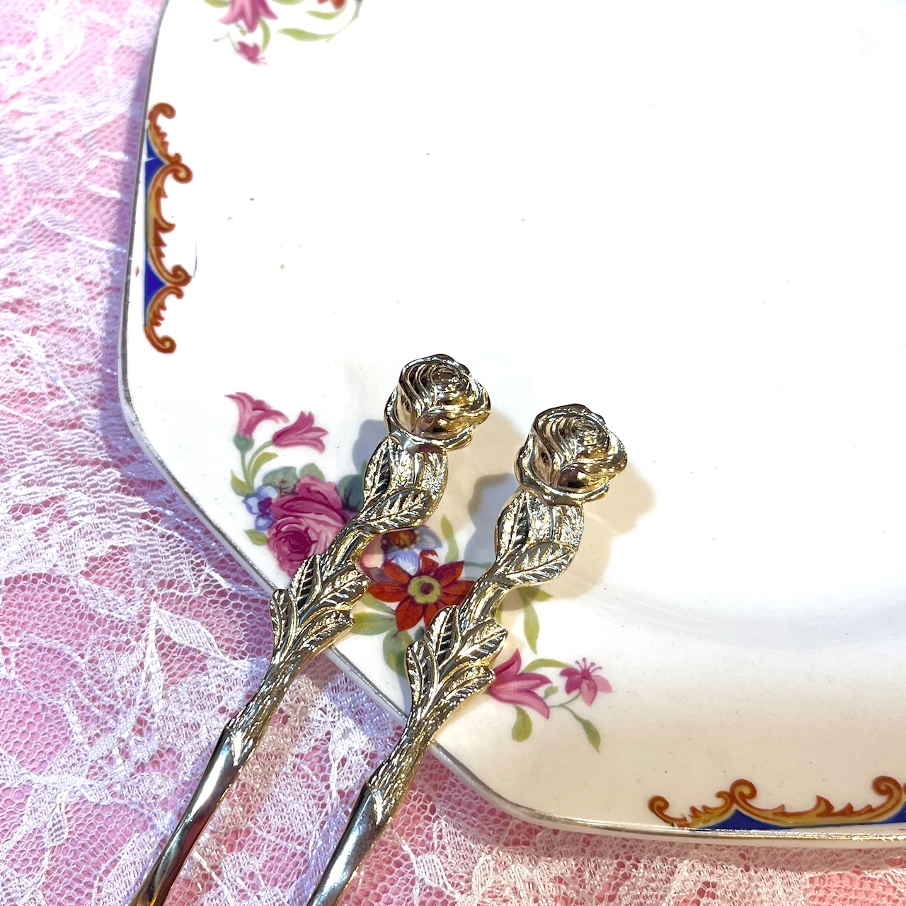 バラの彫刻がエレガントなティースプーンとヒメフォークのセットです。