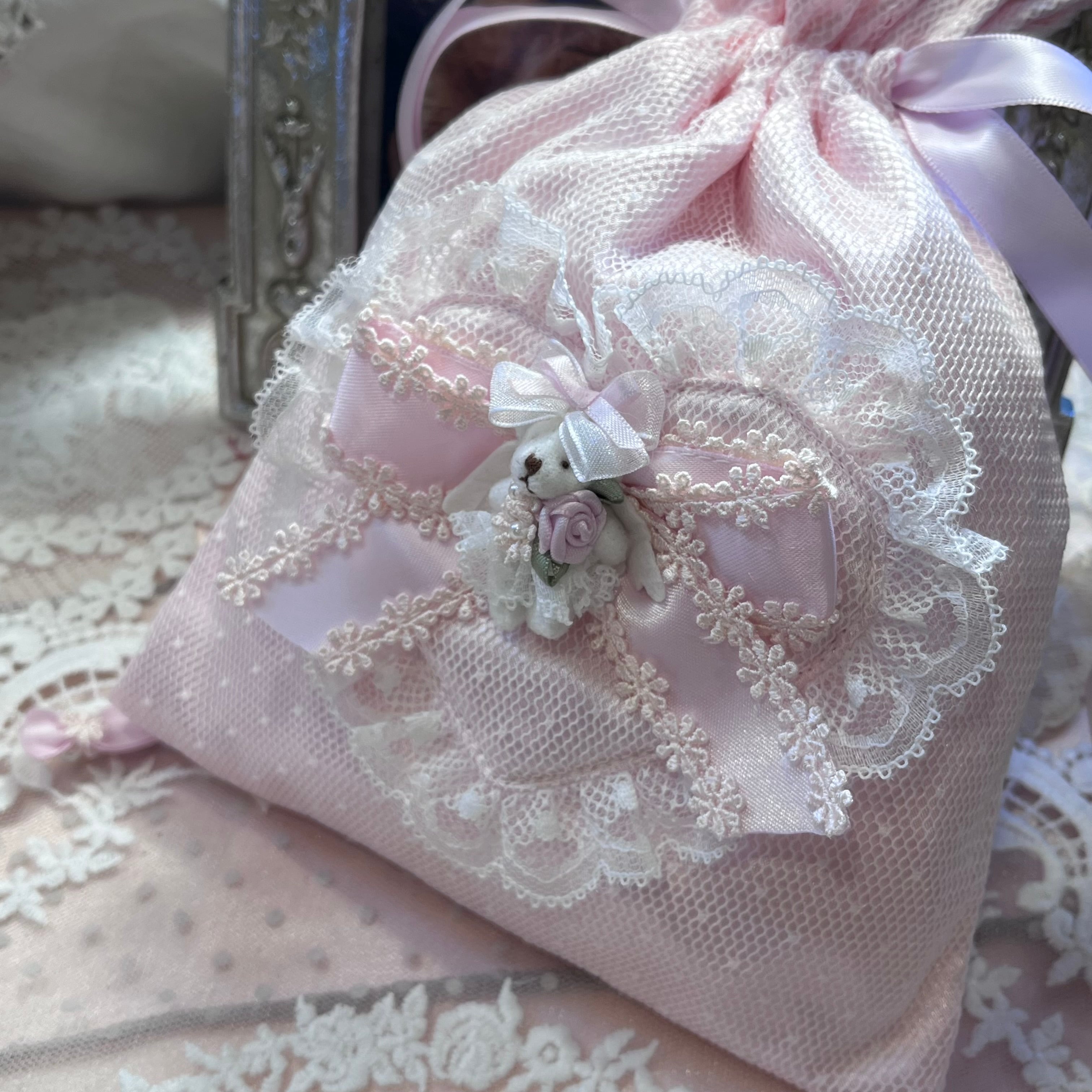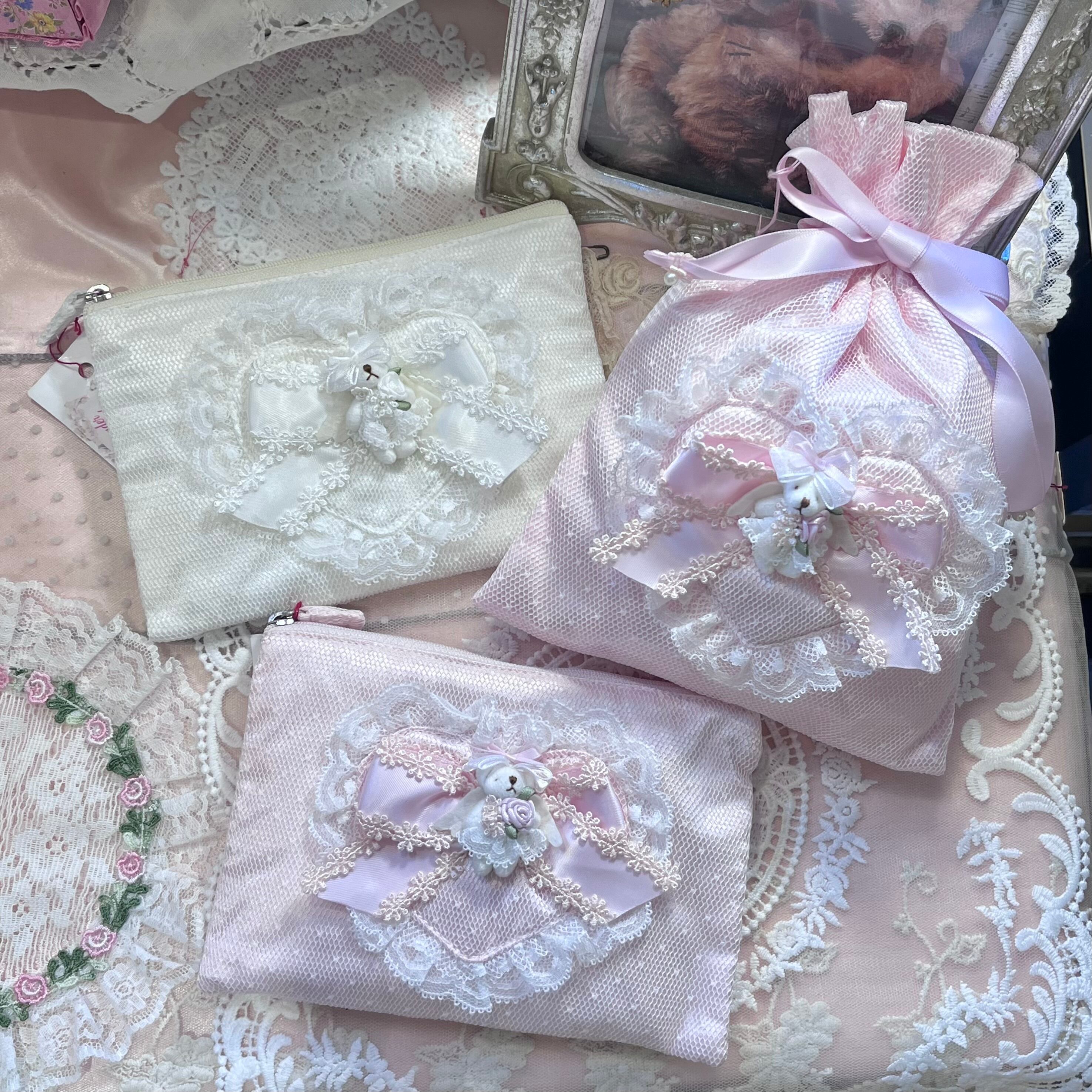淡い色のチュールやレースに小さなくまさんをあしらったとってもガーリーな巾着です♡