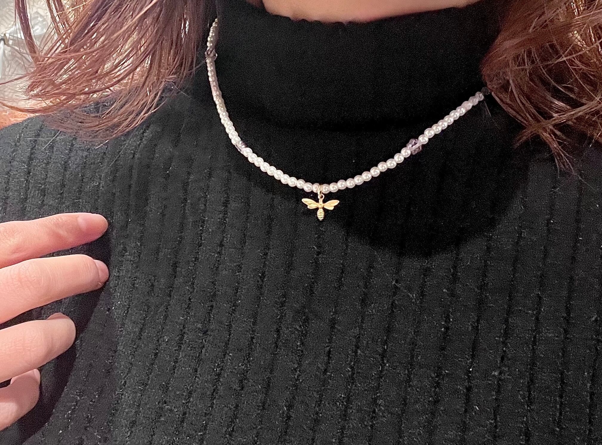 小さなホワイトパールにオーロラパープル(メタリックな薄い紫色)のお花ビーズをmixしたショートネックレス。