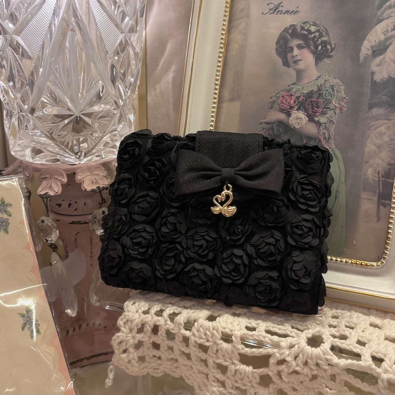 ローズのチュールレースにスワンチャームをあしらったかわいいカードファイルケース。